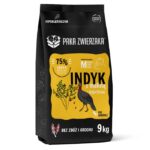 - 75% zawartości indyka, malin, oleju z łososia, ziemniaków oraz ziół