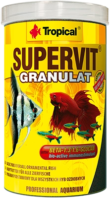 Uniwersalny pokarm w formie granulatu, przeznaczony do codziennego karmienia większości gatunków ryb wszystkożernych, które pobierają pokarm z toni wodnej lub dna akwarium. Potrzeby żywieniowe i energetyczne ryb zabezpiecza niezwykle bogata receptura, na którą składa się kilkadziesiąt wyselekcjonowanych składników najwyższej jakości, w tym skorupiaków, mięczaków i glonów. Układ immunologiczny ryb w walce z patogenami wspierają beta-glukan oraz stabilizowana witamina C. Tak bogaty skład granulatu SUPERVIT sprawia, że ma on szczególne zastosowanie w popularnych akwariach wielogatunkowych, gdzie stanowi podstawę diety uzupełnianą w zależności od potrzeb pokarmami roślinnymi i wysokobiałkowymi
