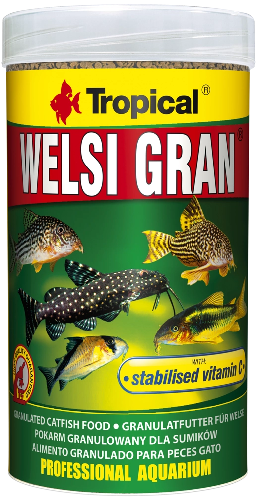 TROPICAL Welsi Gran 100ml granulat to wieloskładnikowy produkt, który przeznaczony jest dla ryb bytujących w strefie dennej. Zalecany jest do codziennego stosowania. Wykarmisz nim ryby mięsożerne oraz wszystkożerne, które żywią się drobinkami z powierzchni dna akwarium. Atutem preparatu jest doskonale zbilansowany skład. Pozwala on na zapewnienie dziennej porcji wartościowych składników, co wpływa na prawidłowy wzrost i rozwój ryb. Formuła pokarmu zawiera przede wszystkim elementy pochodzenia roślinnego i zwierzęcego. Oprócz tego pokarm dla ryb strefy dennej to źródło mikroelementów oraz niezbędnych witamin, które wpływają na ich odporność oraz ogólną kondycję. Dobierając odpowiednie pożywienie, możesz wpłynąć długość życia swoich ryb. Produkt w formie wygodnego w użyciu granulatu po wsypaniu do akwarium swobodnie opada na dno. W naszej ofercie zgromadziliśmy pokarm TROPICAL Welsi w różnych pojemnościach. Znajdziesz opakowania od 100ml nawet do 5000ml, dzięki czemu dopasujesz objętość swoich zapasów do wielkości akwarium oraz ilości osobników.